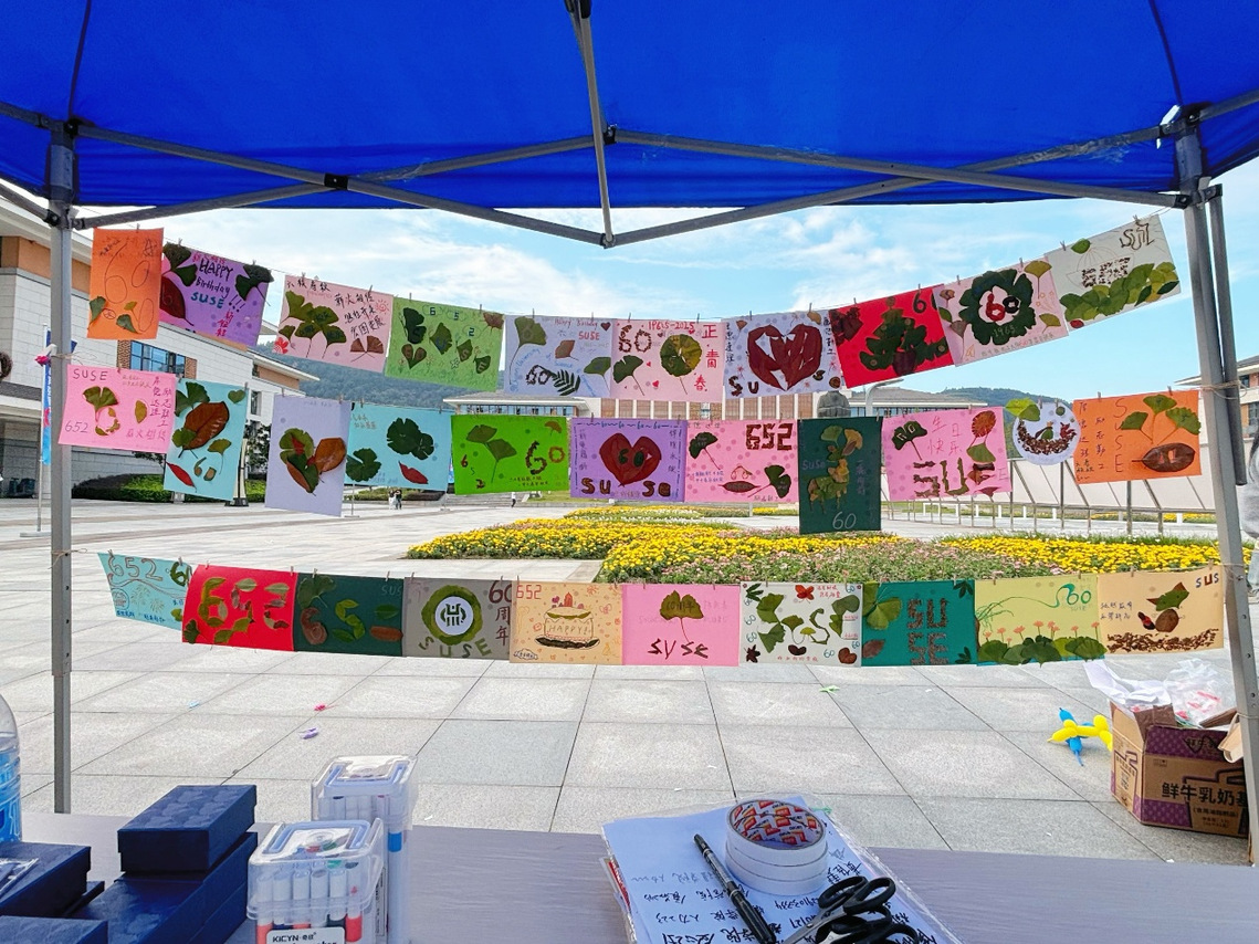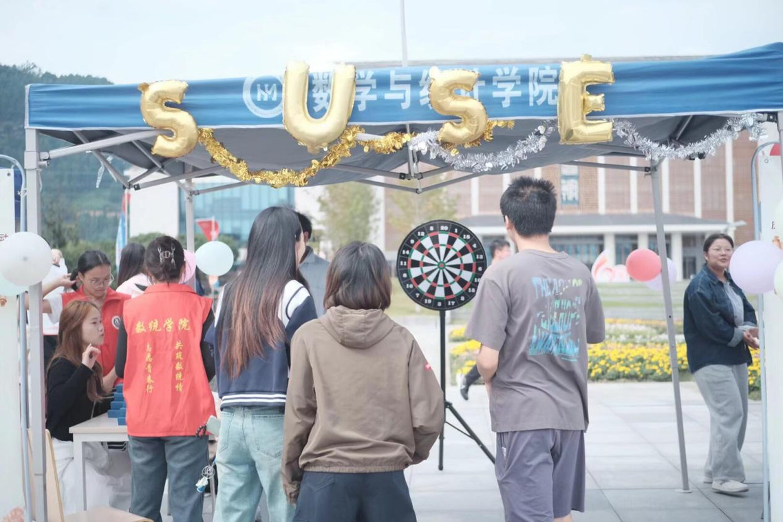 数学与统计学院的摊位前,“SUSE”金色气球格外醒目。飞镖游戏区传来阵阵欢呼,“同心鼓”活动中师生默契配合,引来不少围观。一旁的树叶手工区人气十足,师生们用银杏和枫叶拼出“60”、爱心和校名等图案,将秋日落叶化作对母校的深情祝福。套圈游戏区也排起长队,现场气氛轻松热烈。