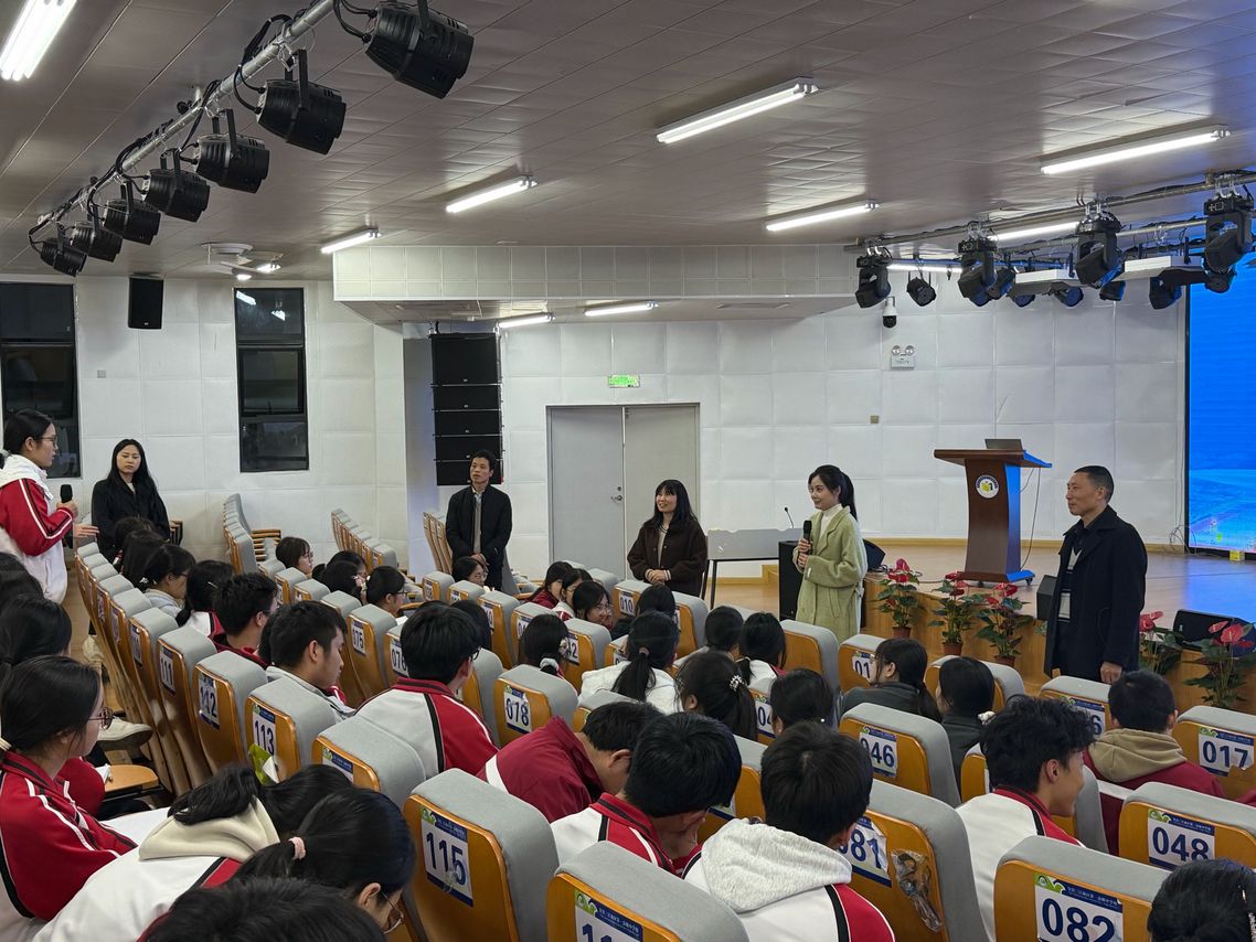 三江一中校长张玲率干部、教师代表对数统学院一行表示热烈欢迎,并深入介绍了该校办学概况与育人文化。随后,学院一行深入三江一中,通过现场宣讲及互动答疑等形式,与高三学生面对面交流。卢天秀副院长向学生介绍了学校办学历史、育人环境及专业设置,重点解读了数统学院三个专业的培养目标、课程体系、实践平台及就业前景,激发学子报考兴趣。在提问环节,学院一行对学生的问题进行了专业解答,活动现场气氛热烈,加深了师生对学校育人理念和专业特色的了解。